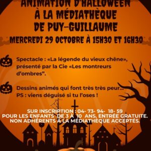 La médiathèque de Puy-Guillaume organisera des animations pour Halloween le mercredi 29 octobre à 15h30 et 16h30. Au programme …