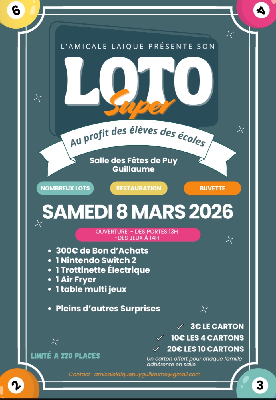 AMICALE LAIQUE : LOTO + Ajouter à mon Agenda Google + iCal / Outlook export 00 jours 00 heures 00 minutes 00 secondes Date Mar 08 2026 Heure 13h00 Catégorie Loisirs Partagez cet événement