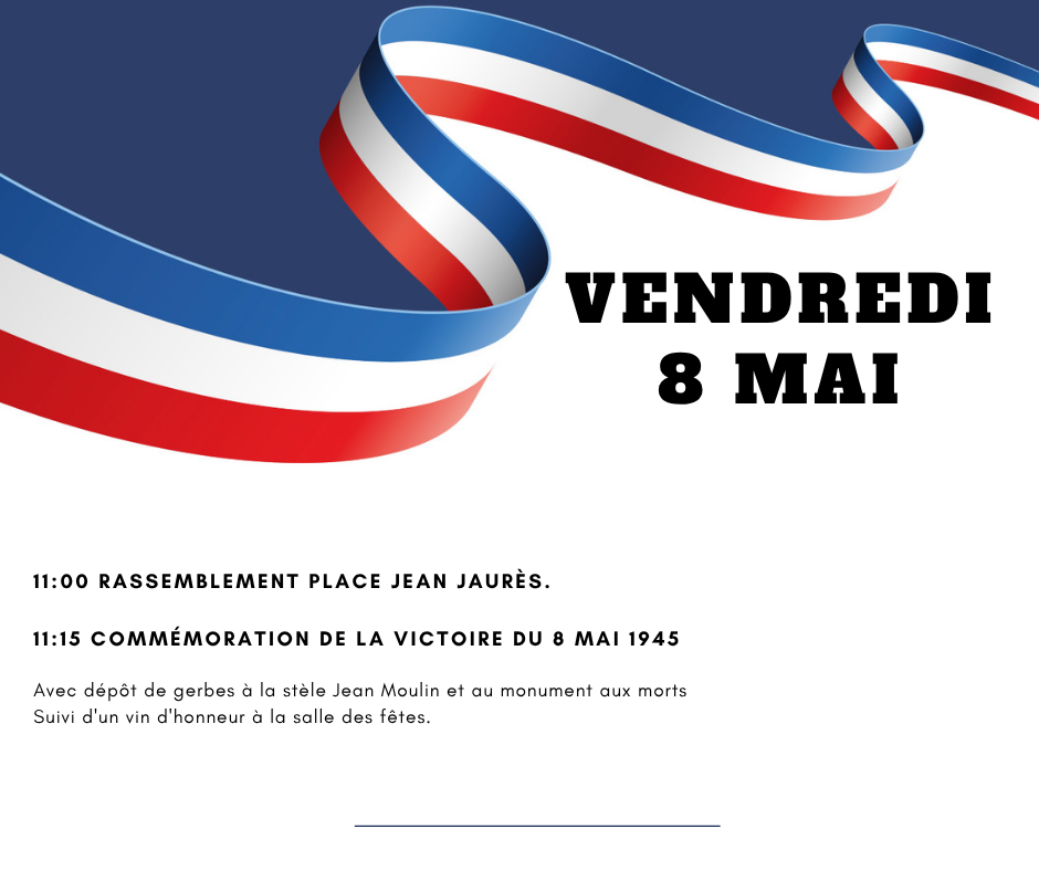 Commémoration : Victoire du 8 mai 1945 + Ajouter à mon Agenda Google + iCal / Outlook export 00 jours 00 heures 00 minutes 00 secondes Date Mai 08 2026 Heure 11h00 Partagez cet événement
