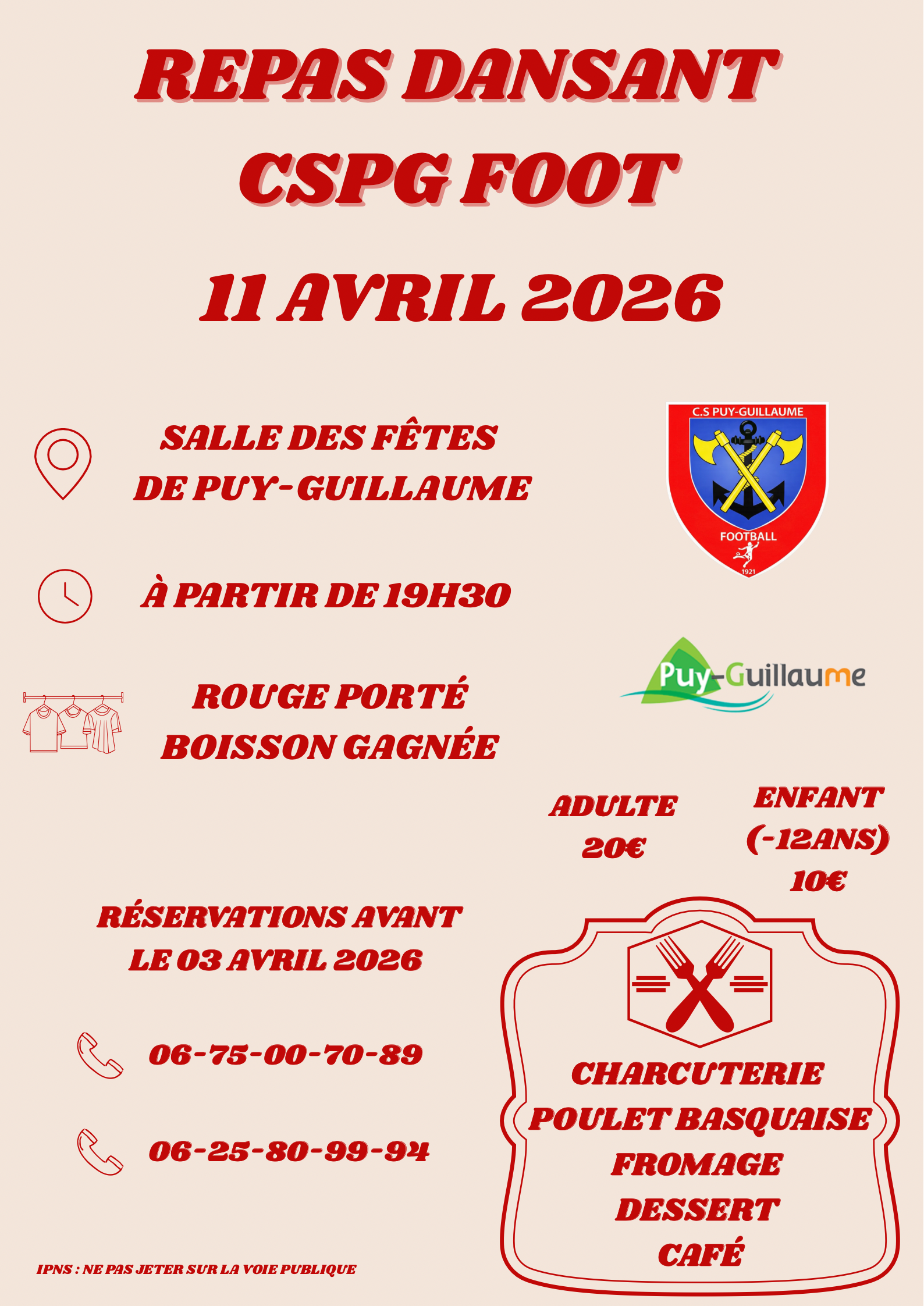 CSPG Foot : repas dansant + Ajouter à mon Agenda Google + iCal / Outlook export 00 jours 00 heures 00 minutes 00 secondes Date Avr 11 2026 Heure 19h30 Partagez cet événement