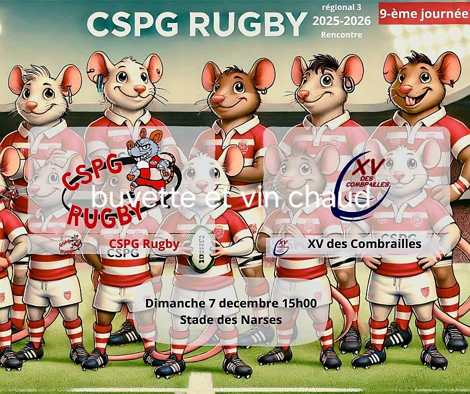 CSPG Rugby : Match rugby + Ajouter à mon Agenda Google + iCal / Outlook export 00 jours 00 heures 00 minutes 00 secondes Date Déc 07 2025 Heure 15h00 Partagez cet événement