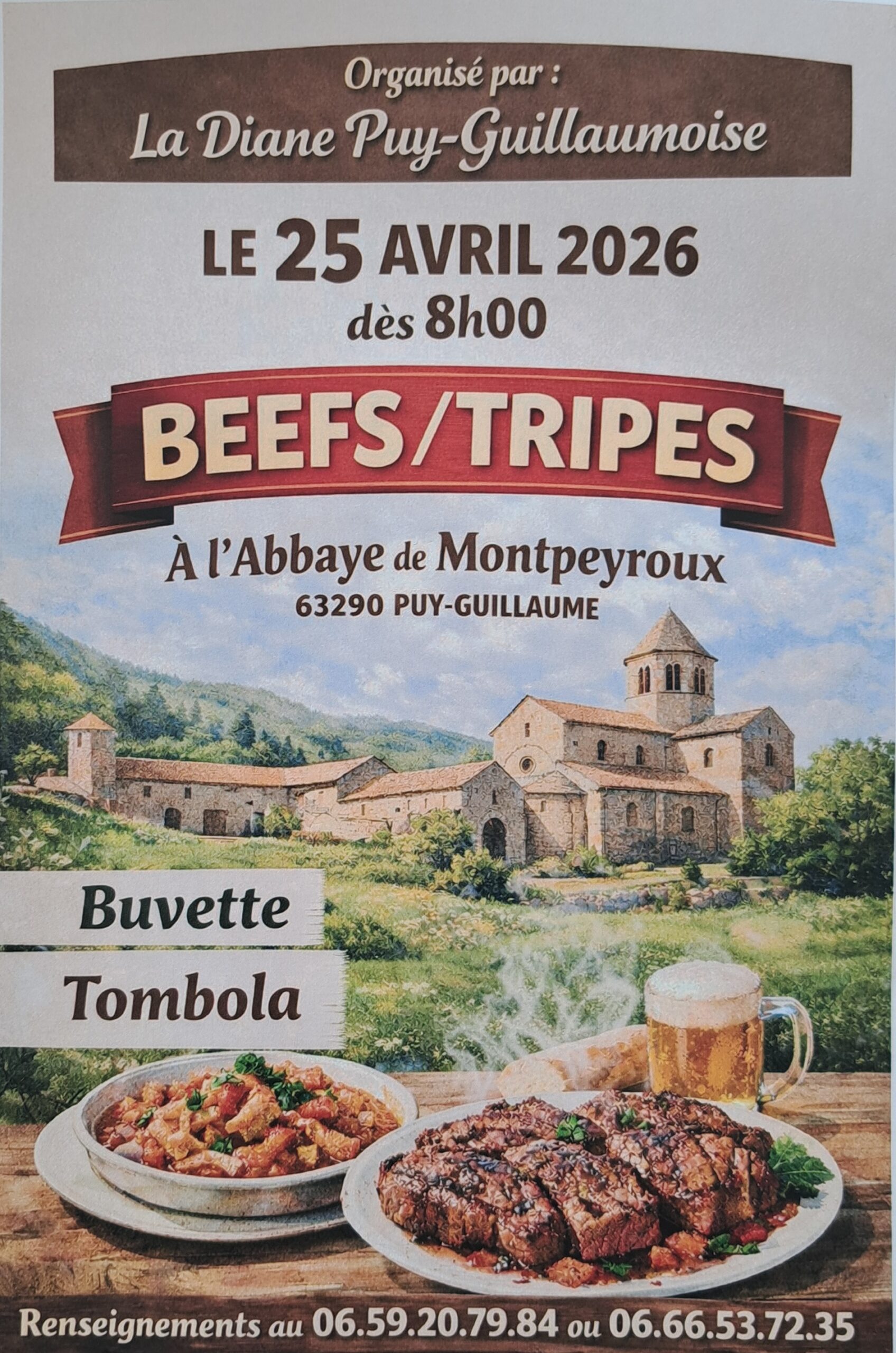 La diane Puy-Guillaumoise : BEEFS-TRIPES + Ajouter à mon Agenda Google + iCal / Outlook export Date Avr 25 2026 Expired! Heure 8h00 Partagez cet événement